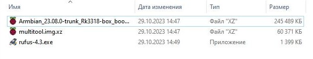 Скачиваем файл Armbian_23.08.0-trunk_Rk3318-box_bookworm_edge_6.3.13_minimal.img.xz и multitool.img.xz