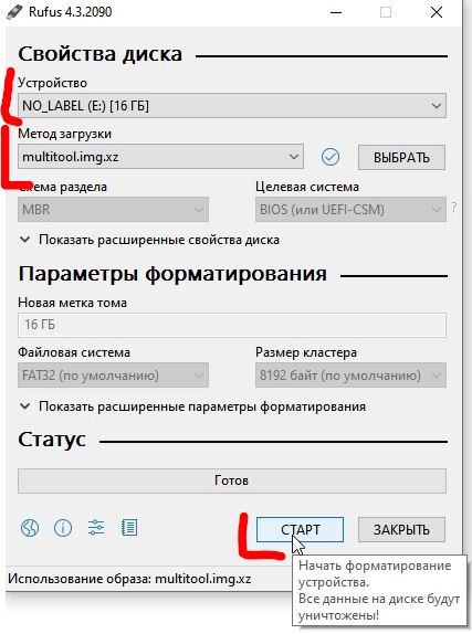 Запускаем Rufus, в поле “Устройство” выбираем флешку на которую будем записывать, а в поле “Метод загрузки” выбираем образ multitool.img.xz и нажимаем кнопку “Старт“. После чего образ multitool благополучно запишется на MicroSD карту.