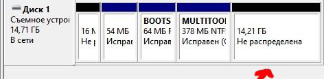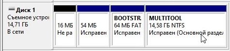 На скриншоте видим 2 раздела: BOOTS и MULTITOOL, и multitool всего 378 Мб, так же есть огромный не распределенный раздел на 14 ГБ, а нужно чтобы раздел multitool был 14 ГБ. Для этого нужно просто вставить MicroSD карту в приставку и включить ее, она загрузится с образом multitool и он автоматически заберет всё нераспределенное пространство. В результате получится вот так: