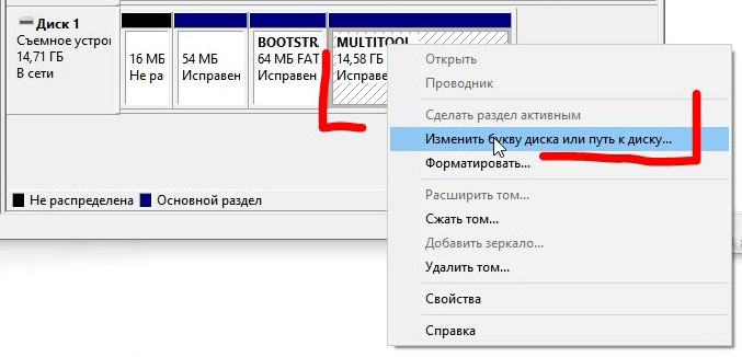 Теперь присвоим букву разделу multitool, иначе он не будет виден в системе, а нам нужно на него закинуть образ Armbian.