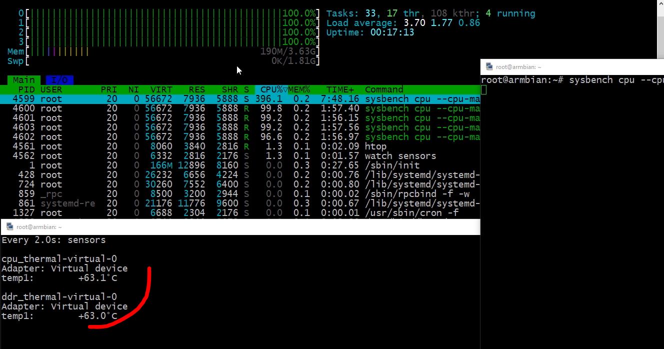 Ещё выполнил тест на нагрев процессора запустив sysbench на бесконечность и посмотрел температуру: