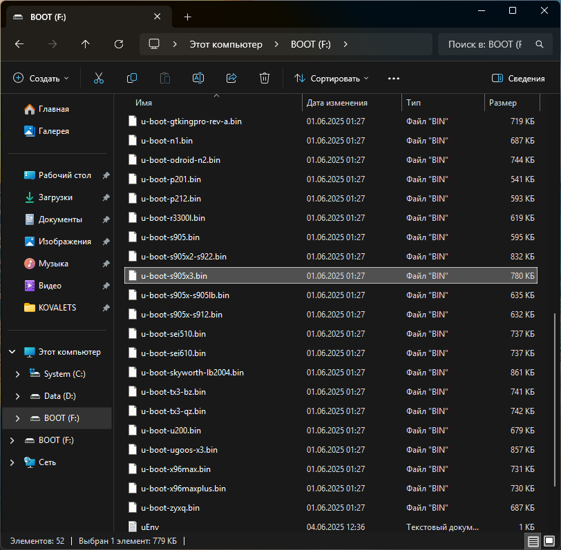 Второй момент, это в корне BOOT нужно найти файл под названием u-boot.ext . Если такого файла нет, то нужно взять файл u-boot-s905x3.bin и переименовать его в файл u-boot.ext