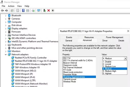 - В свойствах опций сетевого адаптера найдите параметр Roaming Aggressiveness (в нашем примере это сетевой адаптер Realtek)