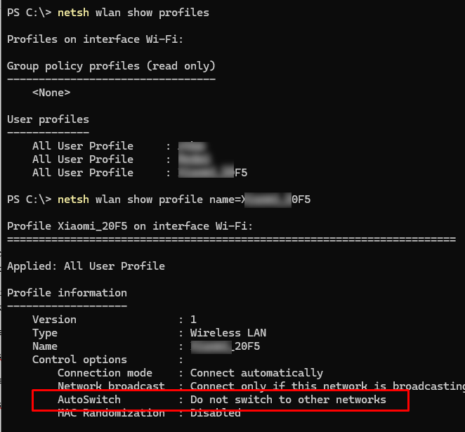 netsh wlan set profileparameter name=Xiaomi_20F5 autoswitch=Yes