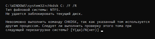 - Ввести Y на предложение «Следует ли выполнить проверку этого тома при следующей перезагрузке системы?», нажать Enter и перезагрузить компьютер. Дождаться завершения проверки.