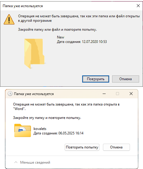 Как было отмечено выше, текст сообщения об ошибке «Папка уже используется» может отличаться, ниже — два примера из Windows 11/10: