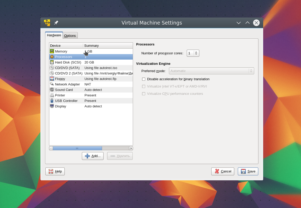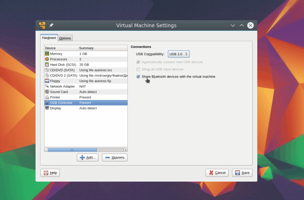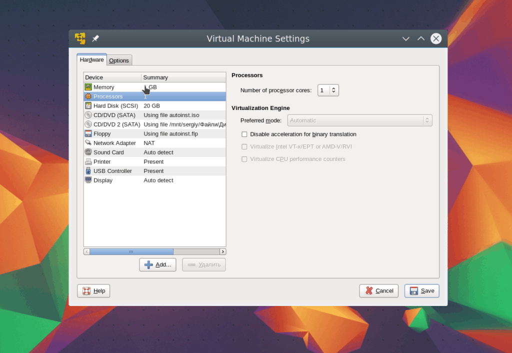 С помощью кнопки "Add" в окне настроек вы можете добавить новое устройство к виртуальной машине, это может быть жесткий диск, сетевой адаптер или накопитель другого типа. Новые устройства добавляются только так: