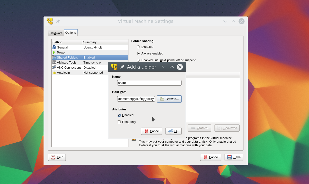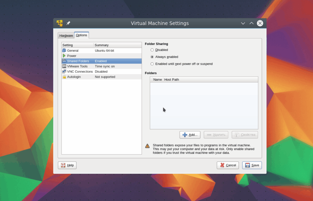 Для ее настройки откройте настройки машины, перейдите на вкладку "Options", затем "Shared Folders".