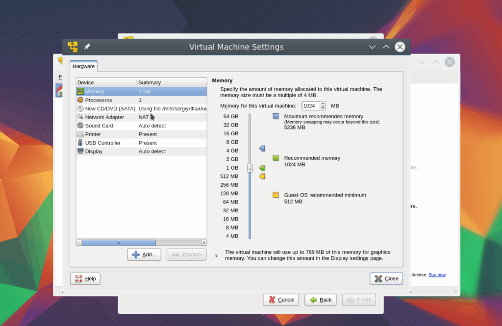 Не всегда настройки по умолчанию нас устраивают. Иногда нужно изменить параметры различного оборудования. Выберите виртуальную машину в меню и нажмите "Virtual Machine Settings" или выберите тот же пункт в строке меню для запущенной машины.