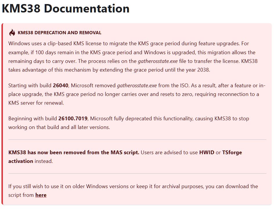 Однако финальным ударом для KMS38 стало необязательное обновление для Windows 11 KB5067036, вышедшее в октябре 2025 года. В нем Microsoft полностью упразднила функциональность GatherOSstate, и после ноябрьского «вторника обновлений» (пакеты KB5068861 и KB5067112) KMS38 окончательно перестал работать.