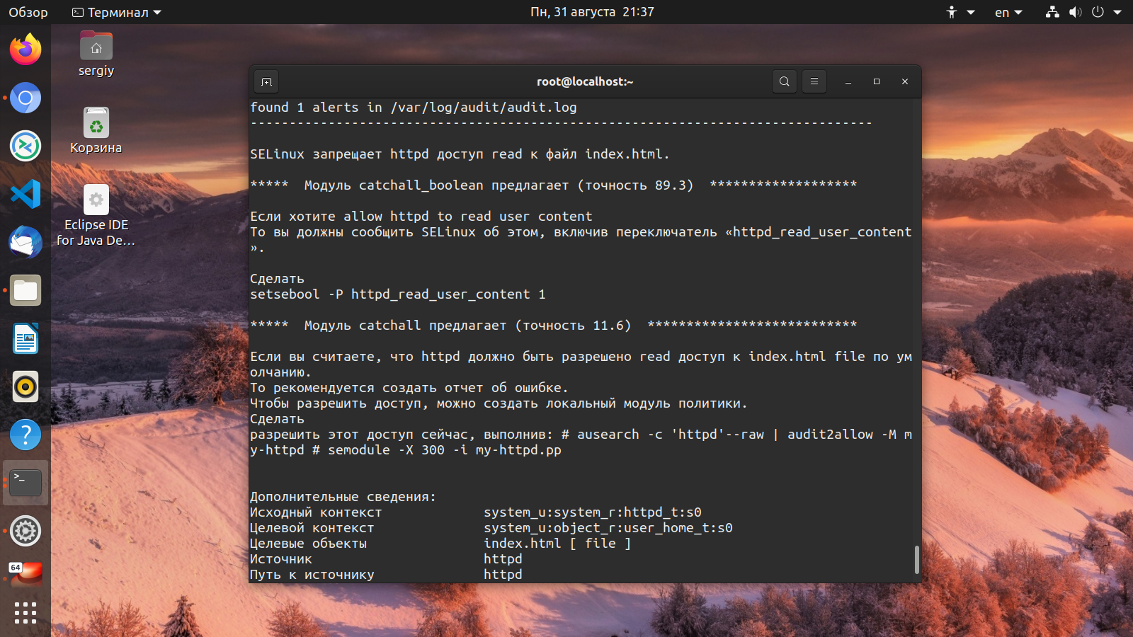 В прошлом пункте было показано, как с помощью утилиты sealert посмотреть возможные решения проблемы доступа. Самое частое решение - создать свой модуль для политики на основе лога. Утилита audit2allow анализирует лог файл, находит там сведения об объектах, к которым нет доступа, а затем разрешает этот доступ в новом модуле. В предыдущем примере утилита sealert посоветовала такую команду: