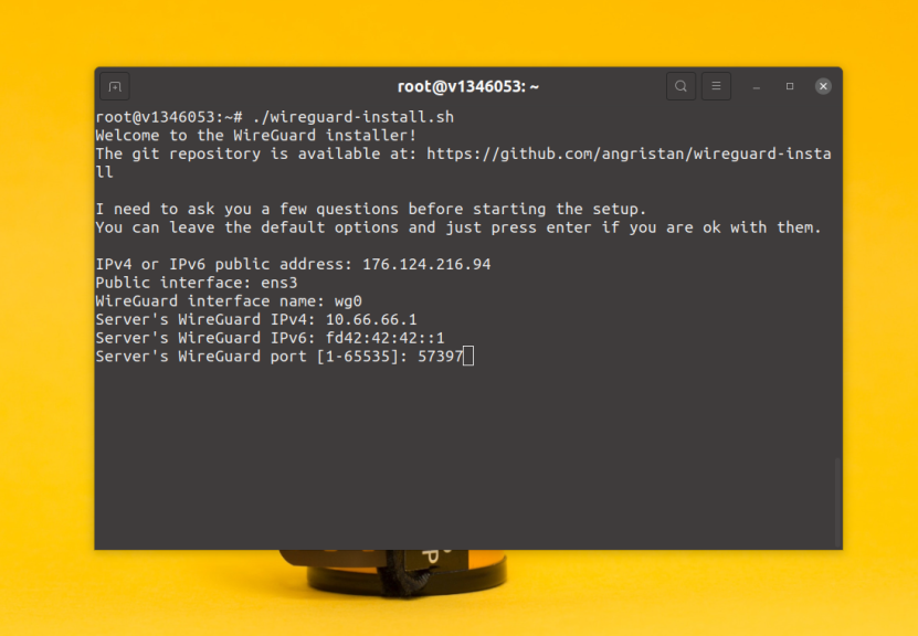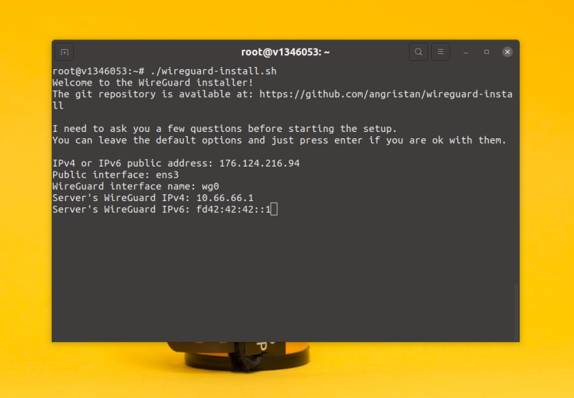 Следующие два вопроса - желаемый IP адрес сервера WireGuard в создаваемой виртуальной сети для IPv4 и IPv6. По умолчанию скрипт предлагает использовать 10.66.66.1: