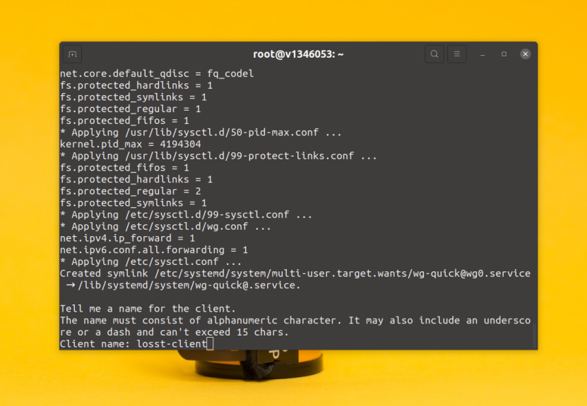 После того как установка завершится скрипт предложит создать конфигурацию для первого клиента. Достаточно ввести имя. Оно не должно быть длиннее 15 символов: