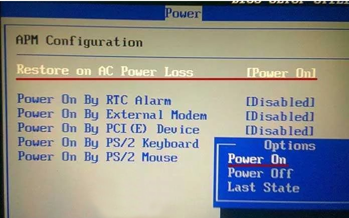- Off (или Power Off): При выборе этой опции компьютер останется выключенным после восстановления питания, независимо от того, в каком состоянии он находился до сбоя. Вам придется включить его вручную, нажав кнопку "Power". Это хороший вариант для обычных домашних или офисных ПК, где нежелательно самопроизвольное включение, например, ночью.