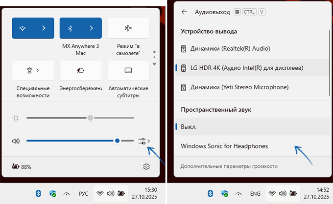 1. Нажать по значку динамика в панели задач, затем — по кнопке настроек и выбрать одну из опций пространственного звука (по умолчанию только Windows Sonic for Headphones).