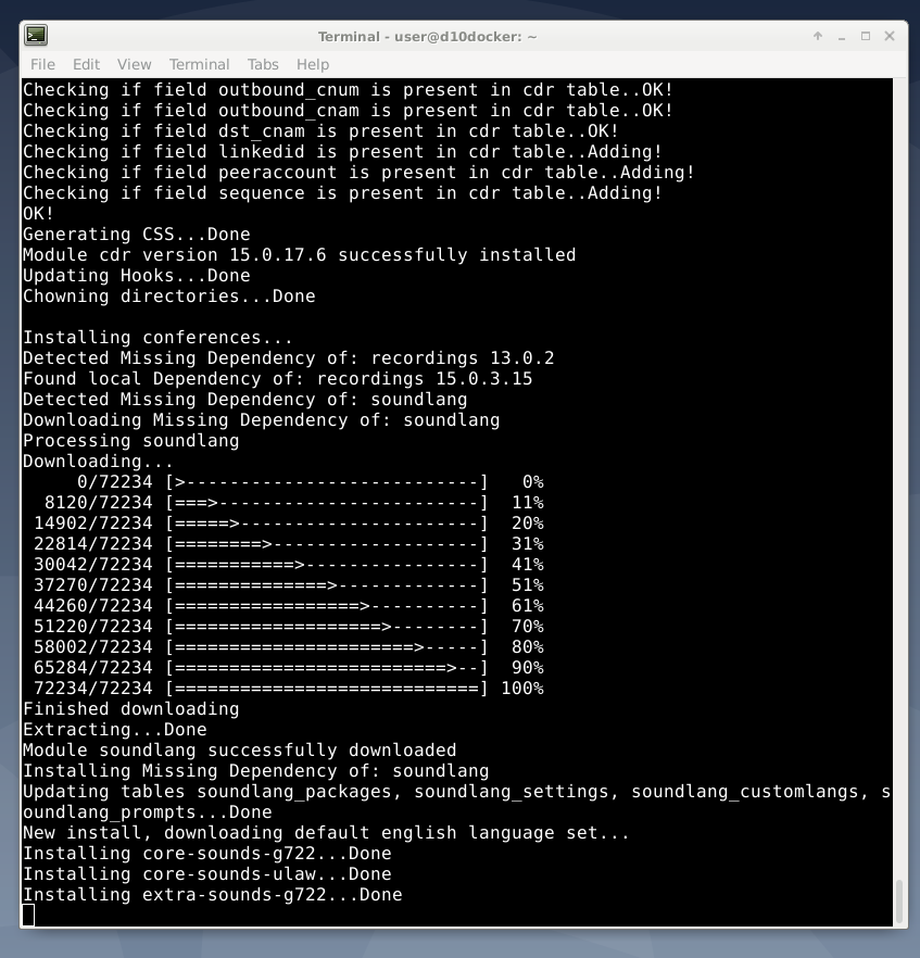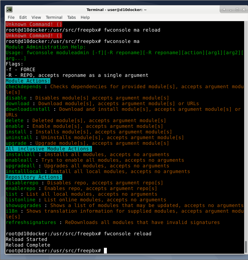 В финале рекомендую установить все необходимые расширения FreePBX из терминала с помощью команды fwconsole