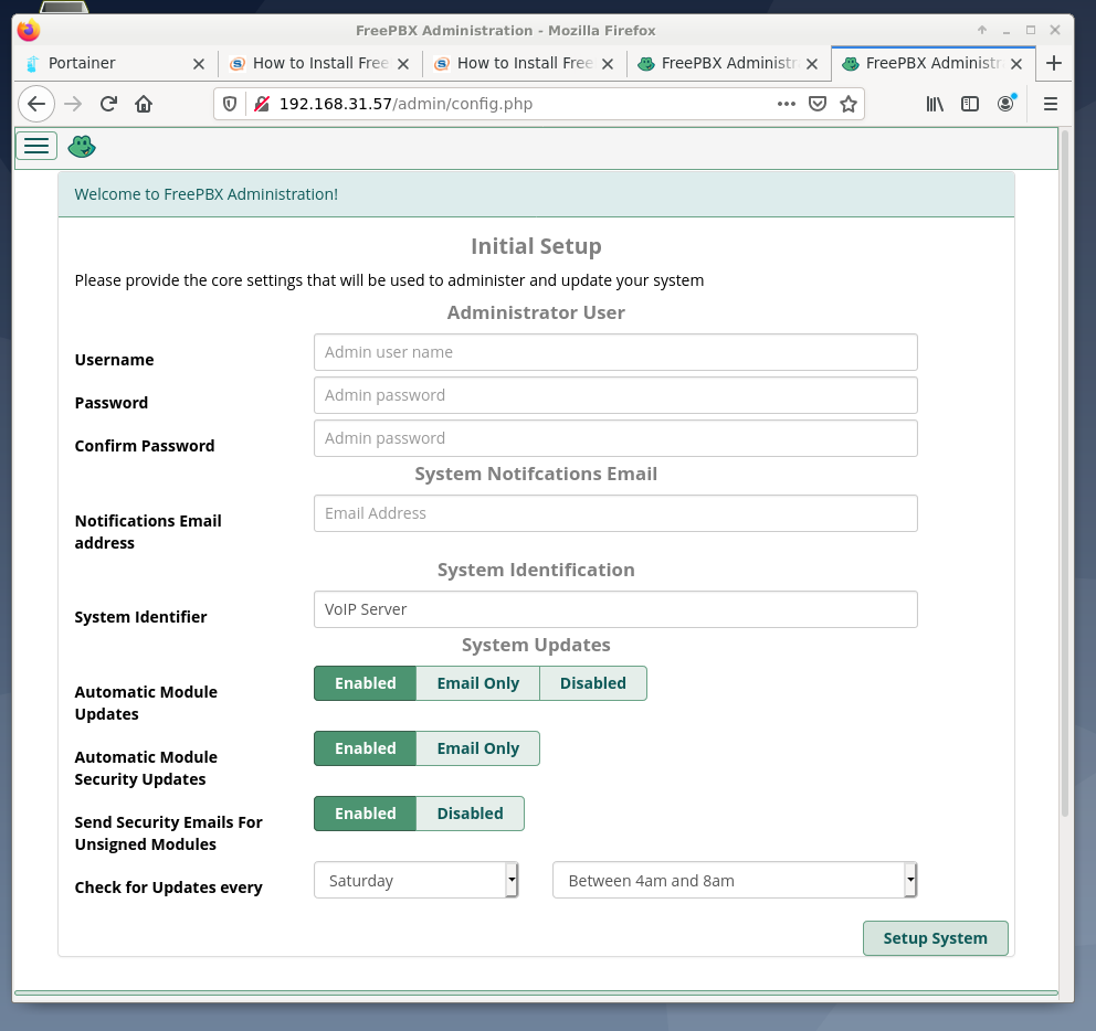 В моем случае это адрес 192.168.31.57, поэтому после ввода в браузере http://192.168.31.57/ откроется окно настройки FreePBX.