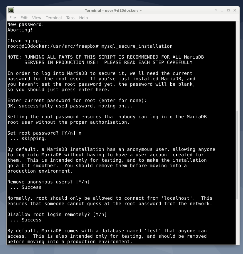 Для единственного сервера цифровой телефонии, хранящего исключительно базы данных Asterisk и FreePBX можно не устанавливать пароль суперпользователя. Однако на рабочей машине, подключенной к Интернет настоятельно рекомендую установить все пароли. Вывод команды и ответы на вопросы, касающиеся обеспечения безопасности установки MariaDB приведу ниже: