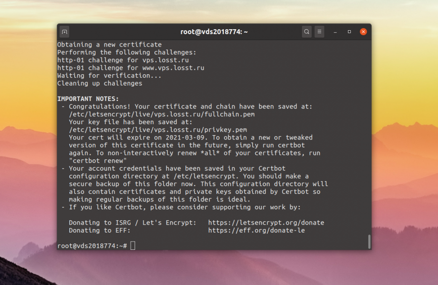 Программа сообщает, что сертификат сохранён в папке /etc/letsencrypt/live/vps.kovalets.net/ и вы можете его использовать.