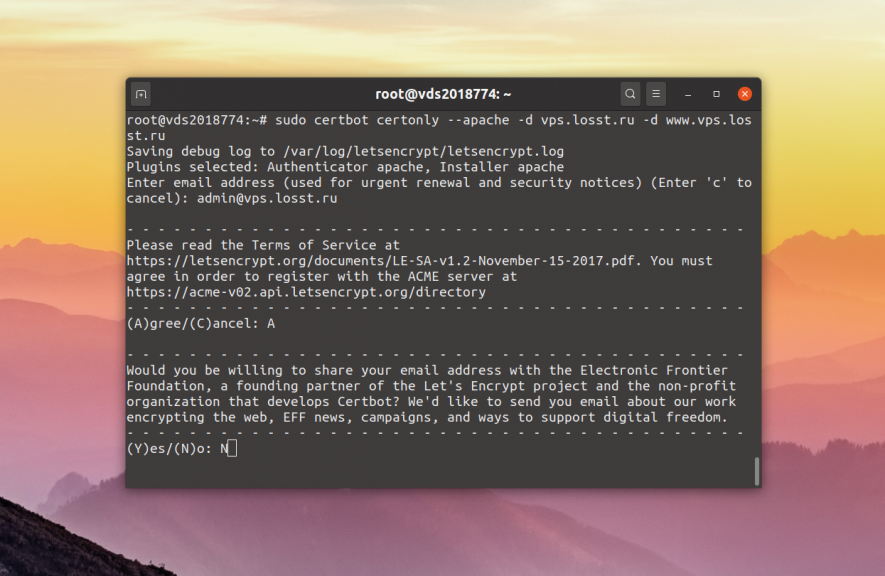 Если вы хотите чтобы утилита также автоматически установила полученный сертификат уберите опцию certonly. При первом запуске утилита предложит вам указать ваш Email адрес, для того чтобы отправлять вам уведомления о необходимости обновить сертификат и новости, а также попросит принять лицензионное соглашение: