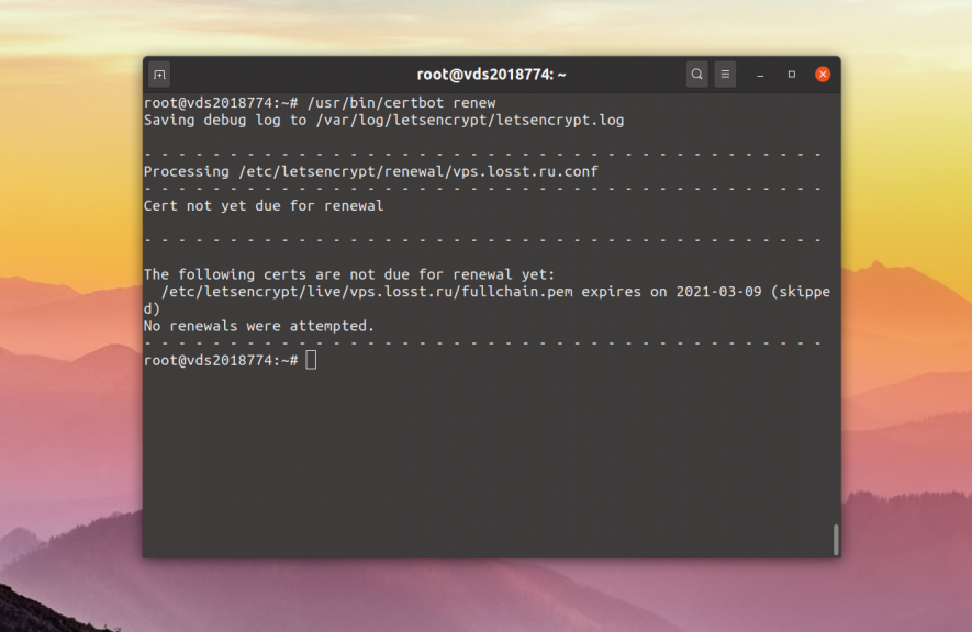 Если сертификат был выдан недавно, то команда проверит его дату истечения и выдаст сообщение, что продление пока не требуется. Если вы создали сертификат для нескольких доменов, то в выводе будет показан только основной домен. Но обновление будет актуально для всех.