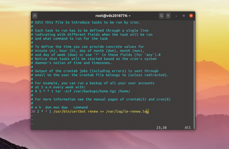Таким образом, мы создали задачу, которая будет выполнять команду обновления каждый понедельник, в 2:30 утра. Информация про результат выполнения будет сохранятся в файл /var/log/le-renewal.log.