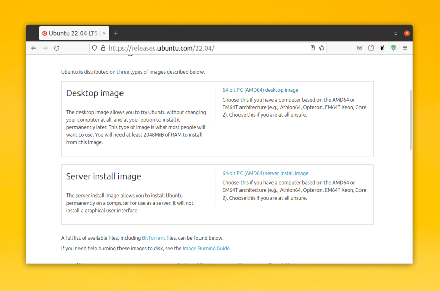 Скачать установочный образ Ubuntu 22.04 можно с официального сайта. Здесь доступен х64 образ для рабочего стола или сервера. В этой версии установочный образ занимает больше трех гигабайт.
