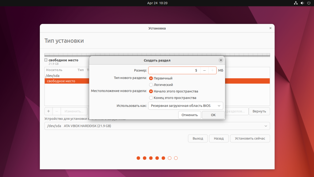 Для создания раздела BIOS boot выберите Свободное место и кликните по кнопке +. В открывшемся окне выберите размер до 5 Мб, а в поле Использовать как выберите Резервная загрузочная область BIOS: