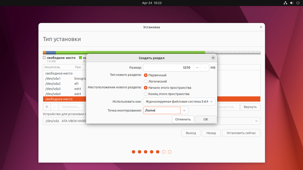 Если вы хотите чтобы ваши личные файлы хранились не на корневом разделе и не терялись при переустановке системы необходимо создать домашний раздел. Для этого создайте новый раздел и выберите файловую систему Ext4, а точку монтирования - /home. Под раздел можно выделить всё оставшееся свободное место: