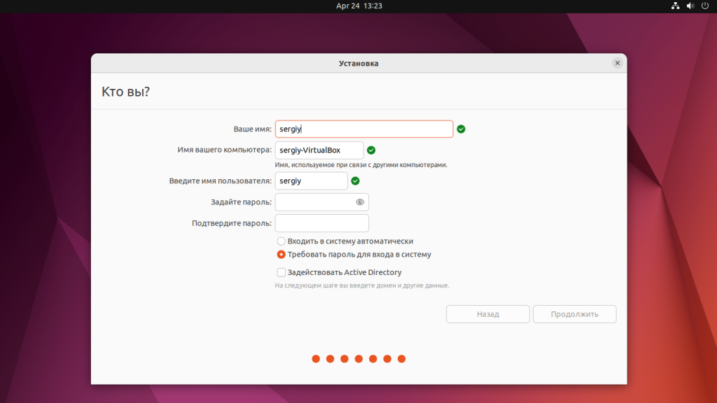 Здесь необходимо указать имя компьютера, а также имя пользователя и пароль от имени которого вы будете использовать систему: