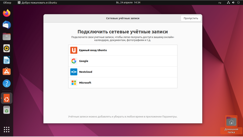 Уже почти готово. Но система предлагает вам ещё настроить несколько моментов. На первом экране мастера вы можете настроить сетевые учётные записи. Например, если добавить сетевую учётную запись Google, то календарь в системе синхронизируется с Google календарем.
