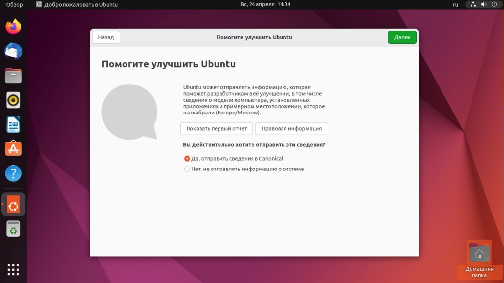 Выберите хотите ли вы, чтобы в Canonical отправлялась информация, которая поможет сделать систему лучше: