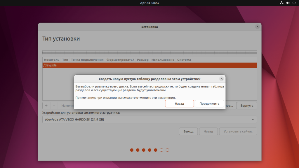 Вы можете пропустить этот шаг если у вас уже есть операционная система и вы хотите установить Ubuntu 22.04 рядом с ней. При создании новой таблицы разделов все данные, которые уже есть на этом диске будут потеряны. Система предупредит об этом: