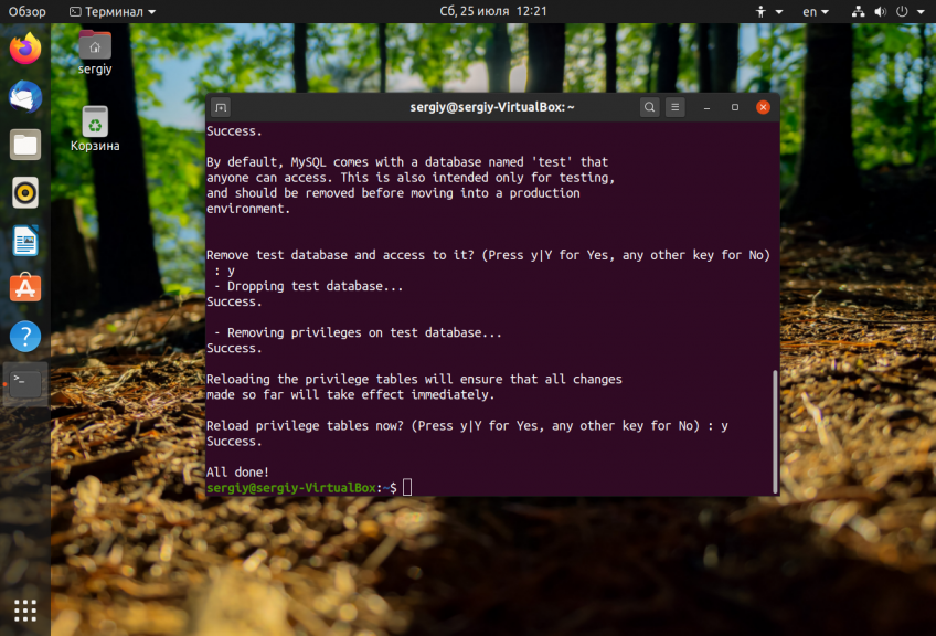 Останется закрыть доступ к аккаунту суперпользователя из сети и отключить гостевой доступ. Вы можете отвечать Y или N, но лучше всё сделать как рекомендует программа и отвечать Y.