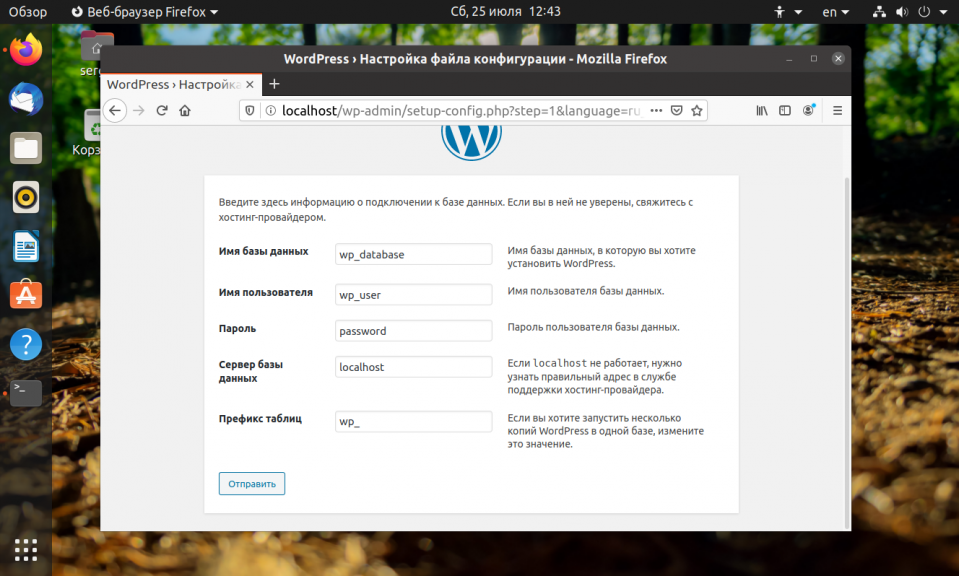 Далее введите имя базы данных, имя пользователя и пароль, которые использовали при создании базы.