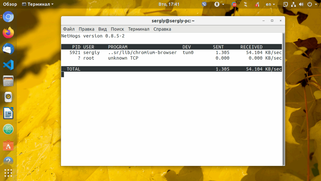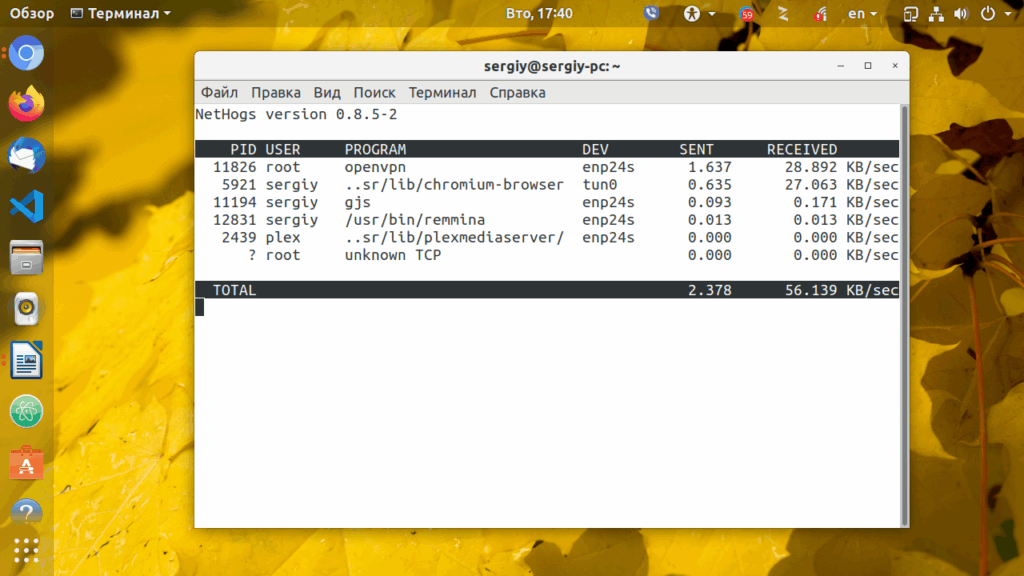 Утилиту NetHogs очень просто использовать. Просто выполните команду nethogs в терминале без каких либо параметров и утилита отобразит сетевую активность для каждого процесса.