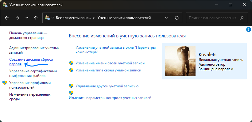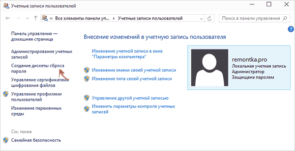 - Нажмите по пункту «Создание дискеты сброса пароля» в списке слева. Если у вас не локальный аккаунт, то такого пункта не будет.