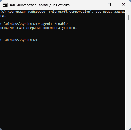 Выполнение команды reagentc /enable для включения среды восстановления в Windows 11/10 использует отдельный образ winre.wim, обычно хранящийся в ОС, и помещает его в имеющийся раздел восстановления на диске.