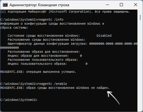 Некоторые пользователи могут столкнуться с необходимостью включить среду восстановления, но, применяя команду reagentc /enable получают сообщение об ошибке «REAGENTC.EXE: образ среды восстановления Windows не найден».